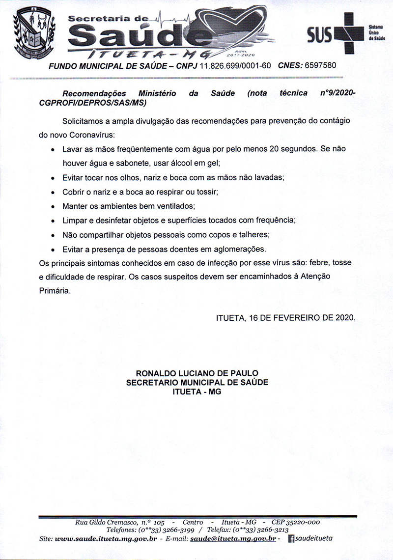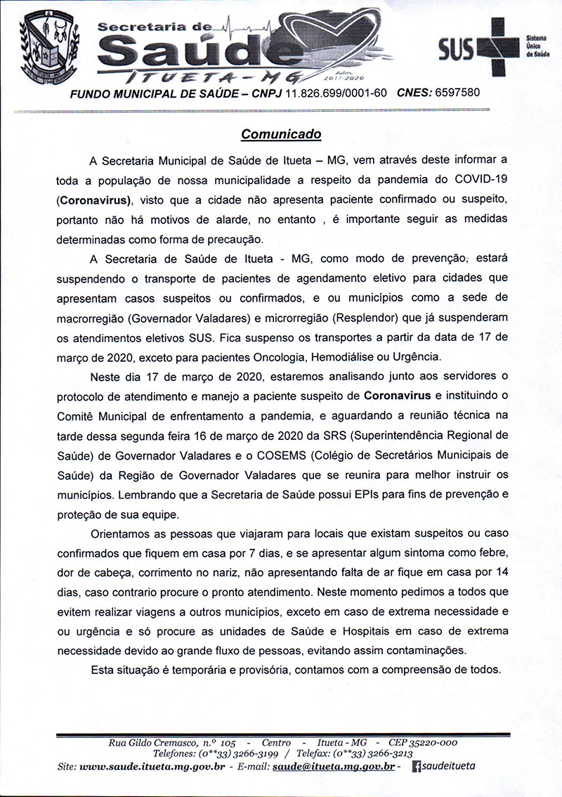 A Secretaria Municipal de Saúde de Itueta-MG, informa toda população de nossa municipalidade a respeito da pandemia do COVID-19.