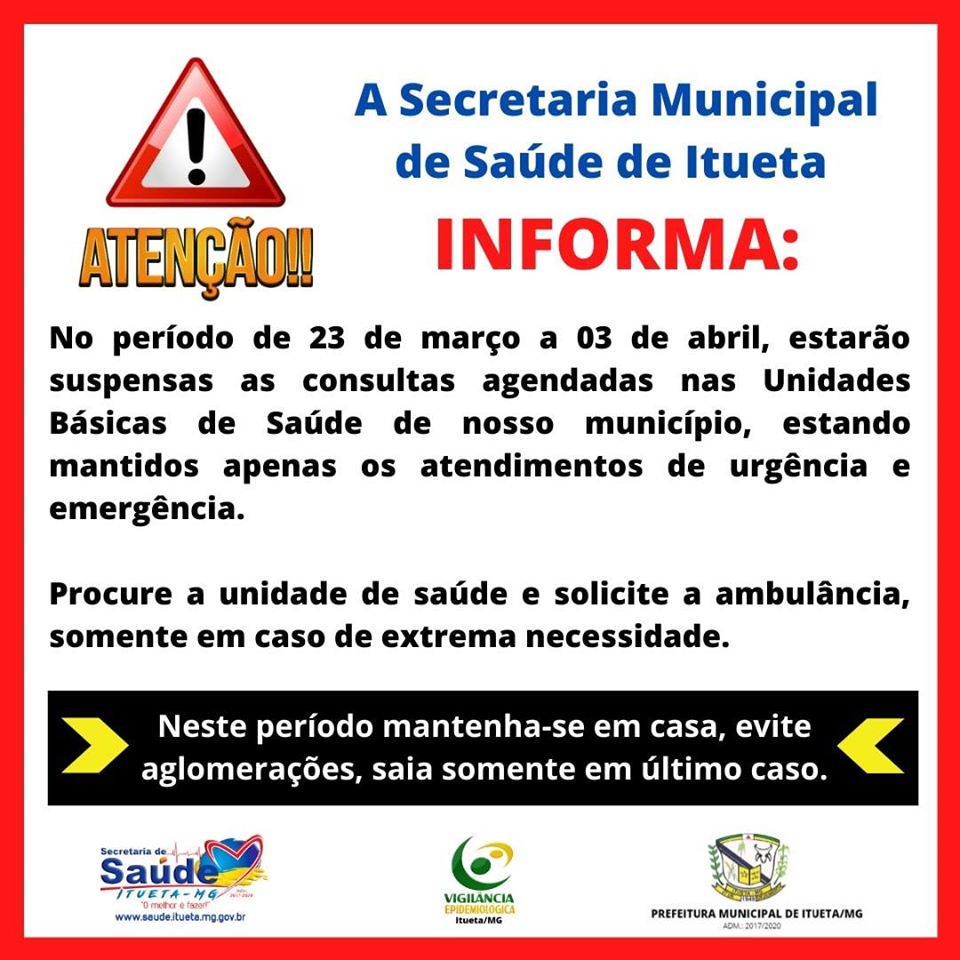 A Secretaria Municipal de Saúde de Itueta-MG, informa toda população de nossa municipalidade a respeito da pandemia do COVID-19.