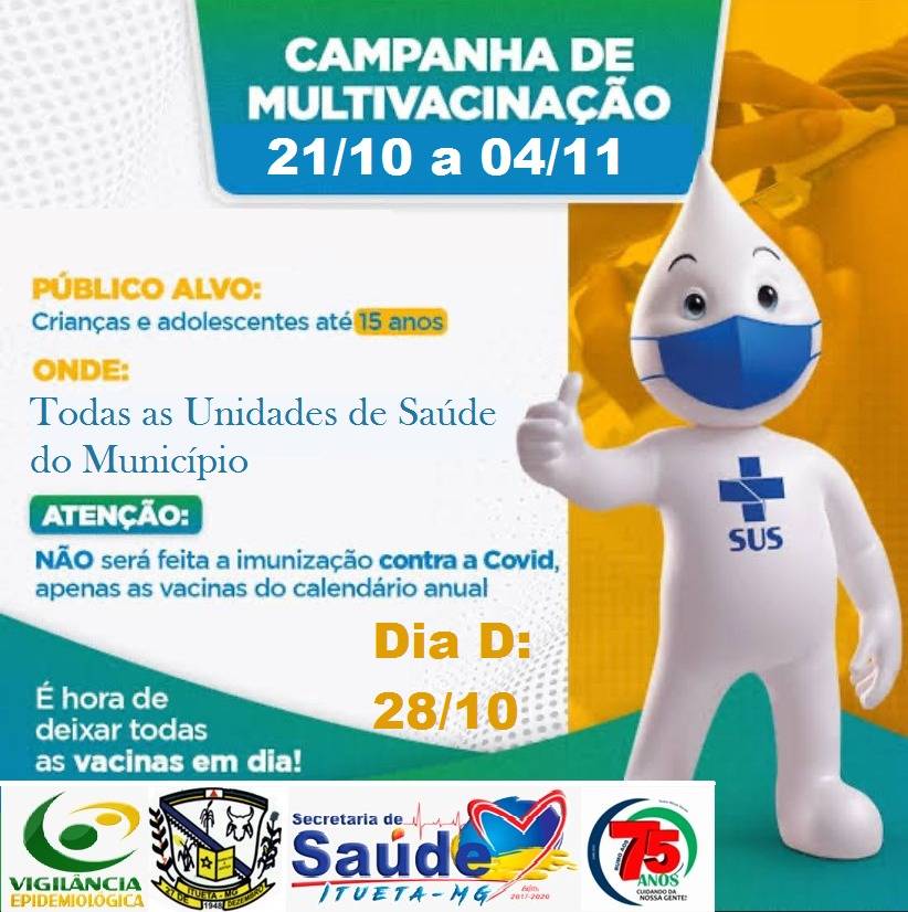 A Secretaria de Saúde de Itueta por meio do serviço de Vigilância Epidemiológica informa que haverá CAMPANHA DE MULTIVACINAÇÃO PARA ATUALIZAÇÃO DE CARTÃO DE VACINA entre os dias...