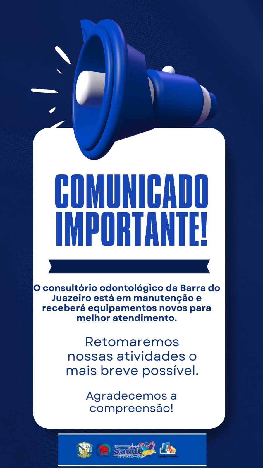Comunicado Importante! Consultório odontológico da Barra do Juazeiro está em manutenção.